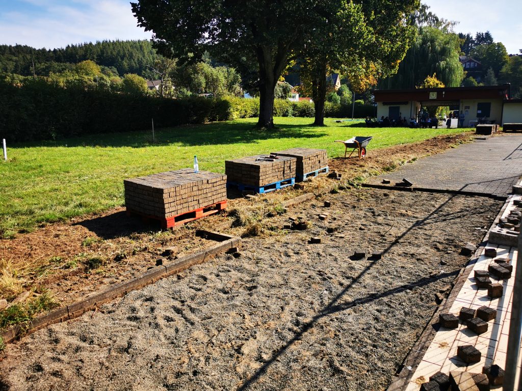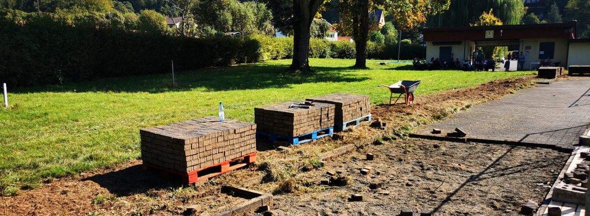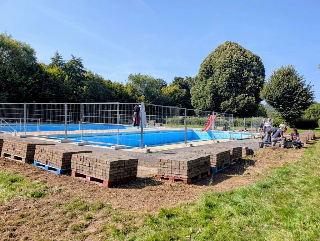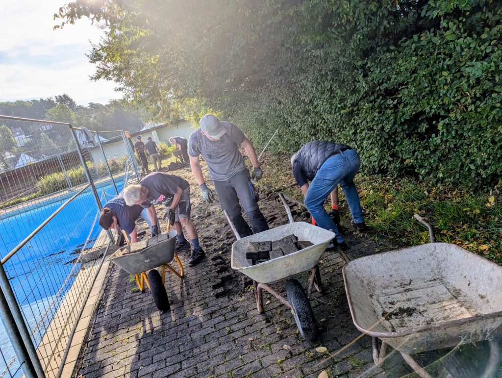 Am Nachmittag war es geschafft: Mehrere Paletten voller Pflastersteine standen ordentlich gestapelt bereit, und das Freibad zeigte sich sichtbar im Wandel. Der Vorstand der Schwimmbadfreunde bedankte sich herzlich bei allen Anwesenden und betonte, dass dies nur der Anfang war. In den kommenden Wochen wird es weitere Einsätze geben – und wieder viele helfende Hände brauchen.