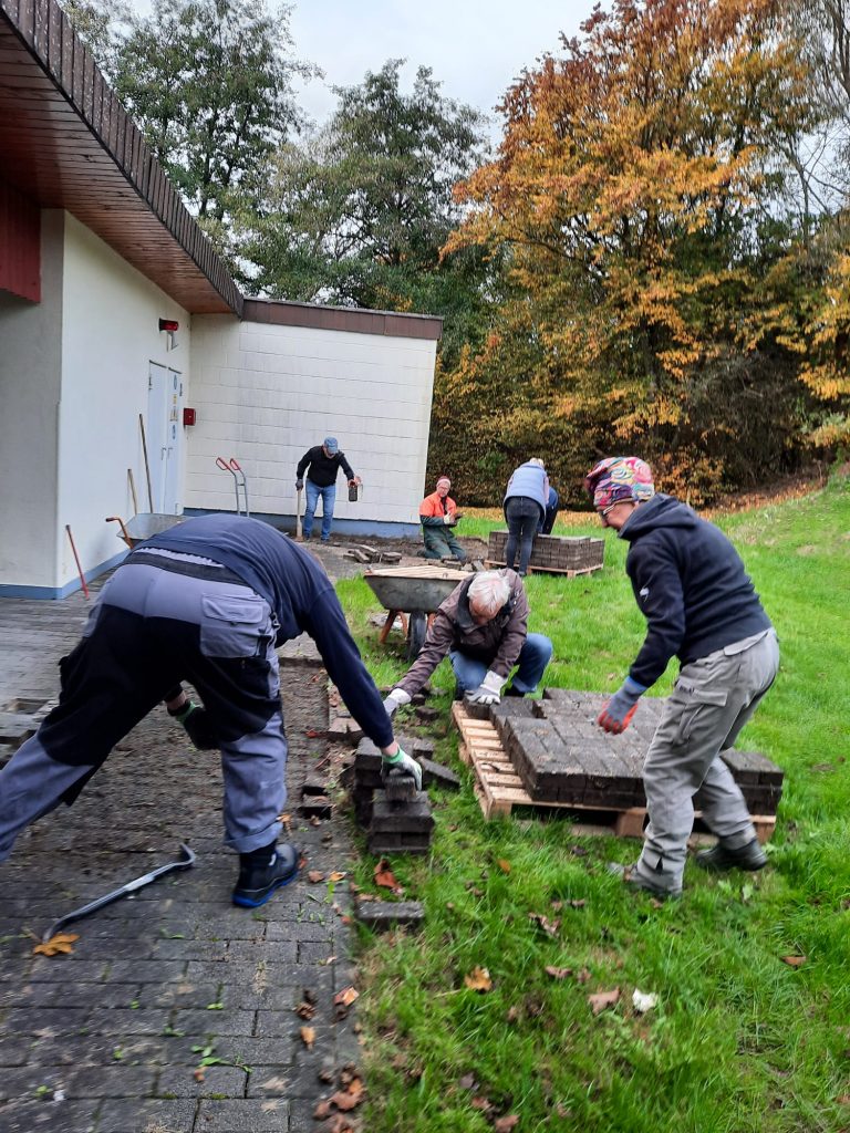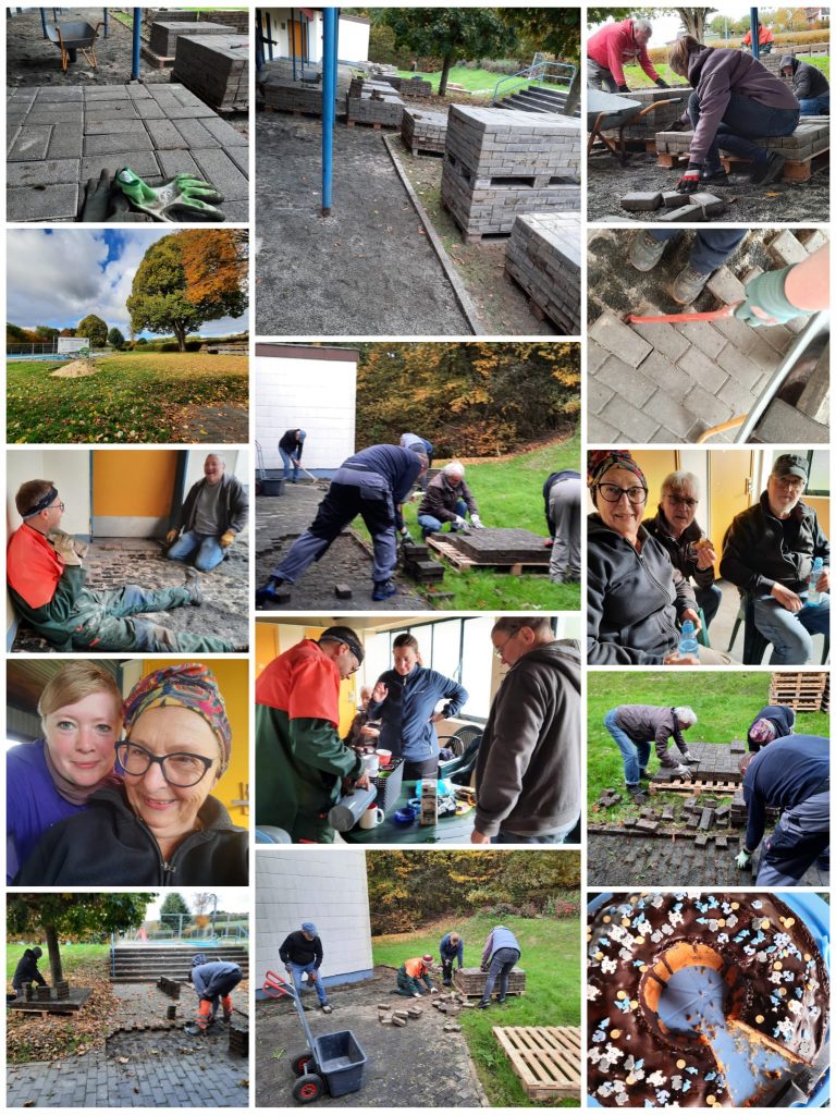 In den Pausen, bei Kaffee und Kuchen, wurde herzlich gelacht und über „Gott und die Welt“ gesprochen – bis wieder die Steine flogen. Nach ein paar Stunden war der ganze Spuk auch schon vorbei. Die Paletten waren voll und vor den alten Umkleidekabinen schaute nach fast 60 Jahren nur noch der nackte Split heraus.